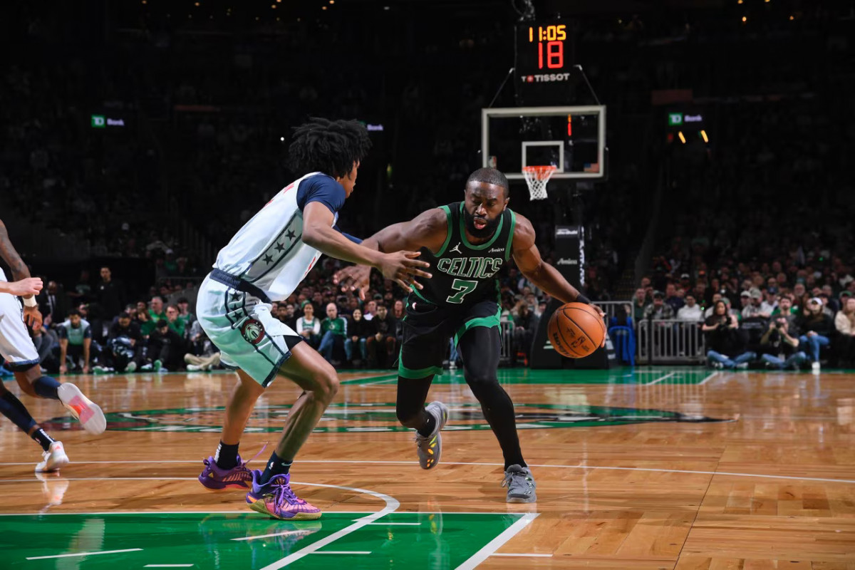 (Photo courtesy of the Celtics) “Photograph of the Boston Celtics facing off against the Washington Wizards.”