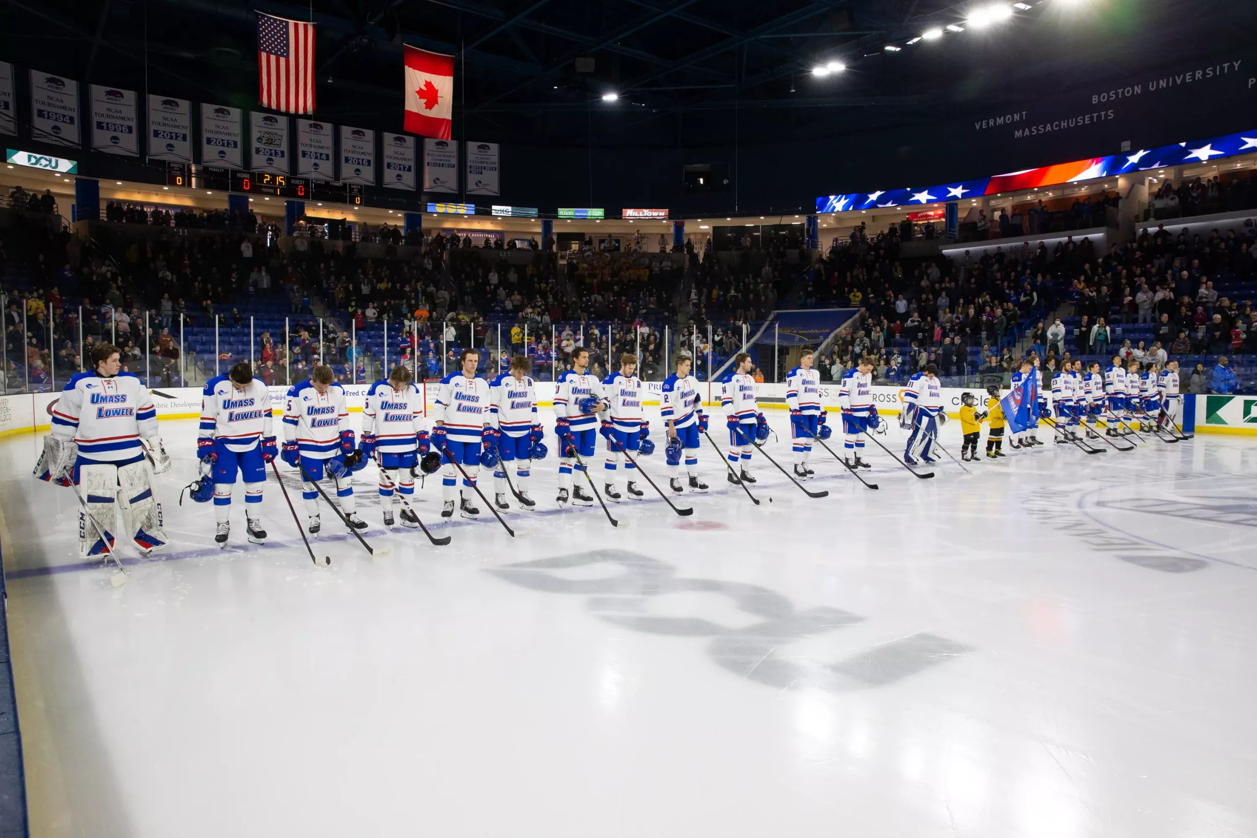 (Photo courtesy of the UMass Lowell Athletics/Rich Gagnon) “UMass Lowell River Hawks taking off their helmets for the Pledge of Allegiance before a game last season.”