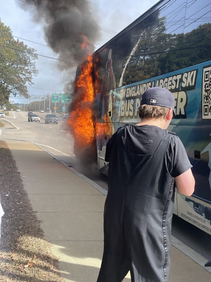 On Sunday, October 19th, a bus carrying around 40 members of the UMass Lowell Marching Band on their way to an exhibition performance for the Massachusetts Instrumental Choral & Concert Association (MICCA) at Norwood High School caught on fire off Route 109 in Westwood.