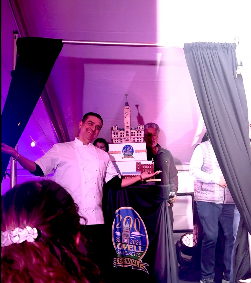 (Photo courtesy of Aaliyah Afolabi) Buddy Valastro with his Lowell Bicentennial themed cake of City Hall