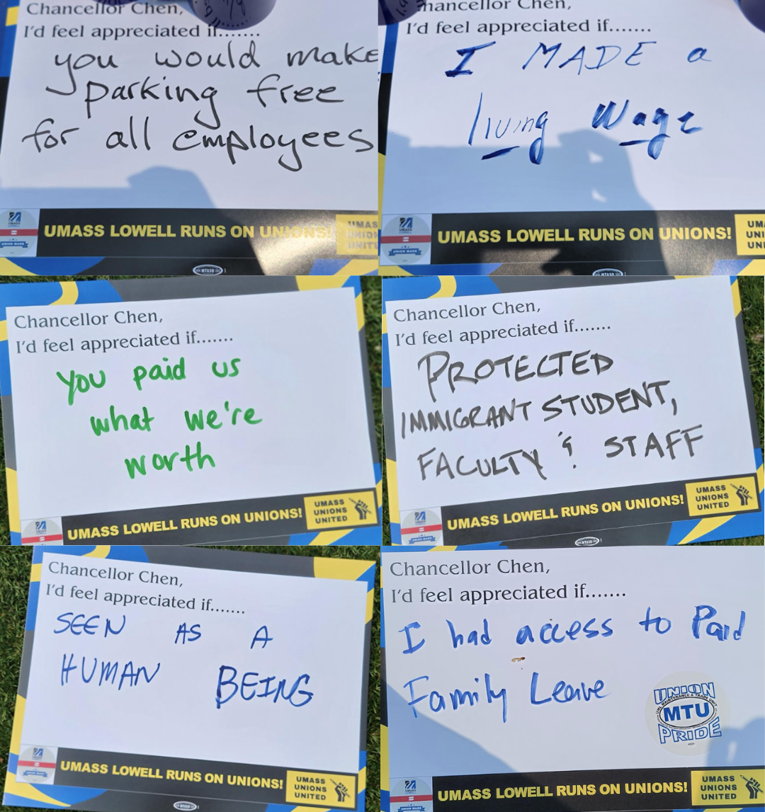 (Photo courtesy of Judith Aquino) Signs made by union members as part of the UMass Lowell Unions United action on Faculty and Staff Appreciation Day in 2025