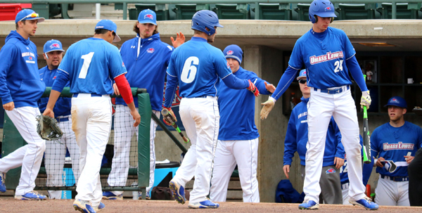 038_600_Consolmango_scores April 9, 2016 Joe Consolmagno is congratulated by his teammates after crossing home plate. (All photos by George DeLuca/Connector