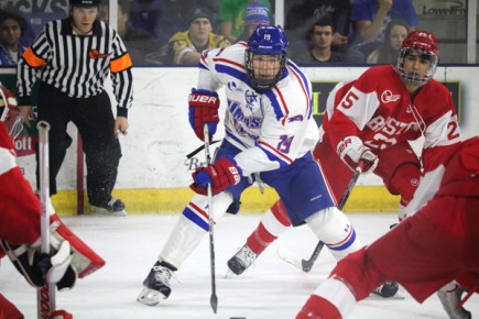 Adam Chapie tees up the puck just before his first of two goals in the River Hawks’ victory over Boston University Saturday night at the Tsongas Center. (Photo by George DeLuca/Connector) Marlon Pitter Connector Editor A hat trick by junior defenseman Dylan Zink and two goals from senior forward Adam Chapie paved the way for…