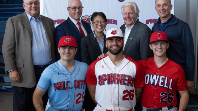 (Photo courtesy of Bruce Preston, UMass Lowell) “The community celebrated the return of the Lowell Spinners as the latest franchise of the Futures Collegiate Baseball League on Tuesday, Nov. 18, at a press conference held at the Tsongas Center at UMass Lowell. Wearing the team’s new uniforms, front row, from left, are franchise team leaders…